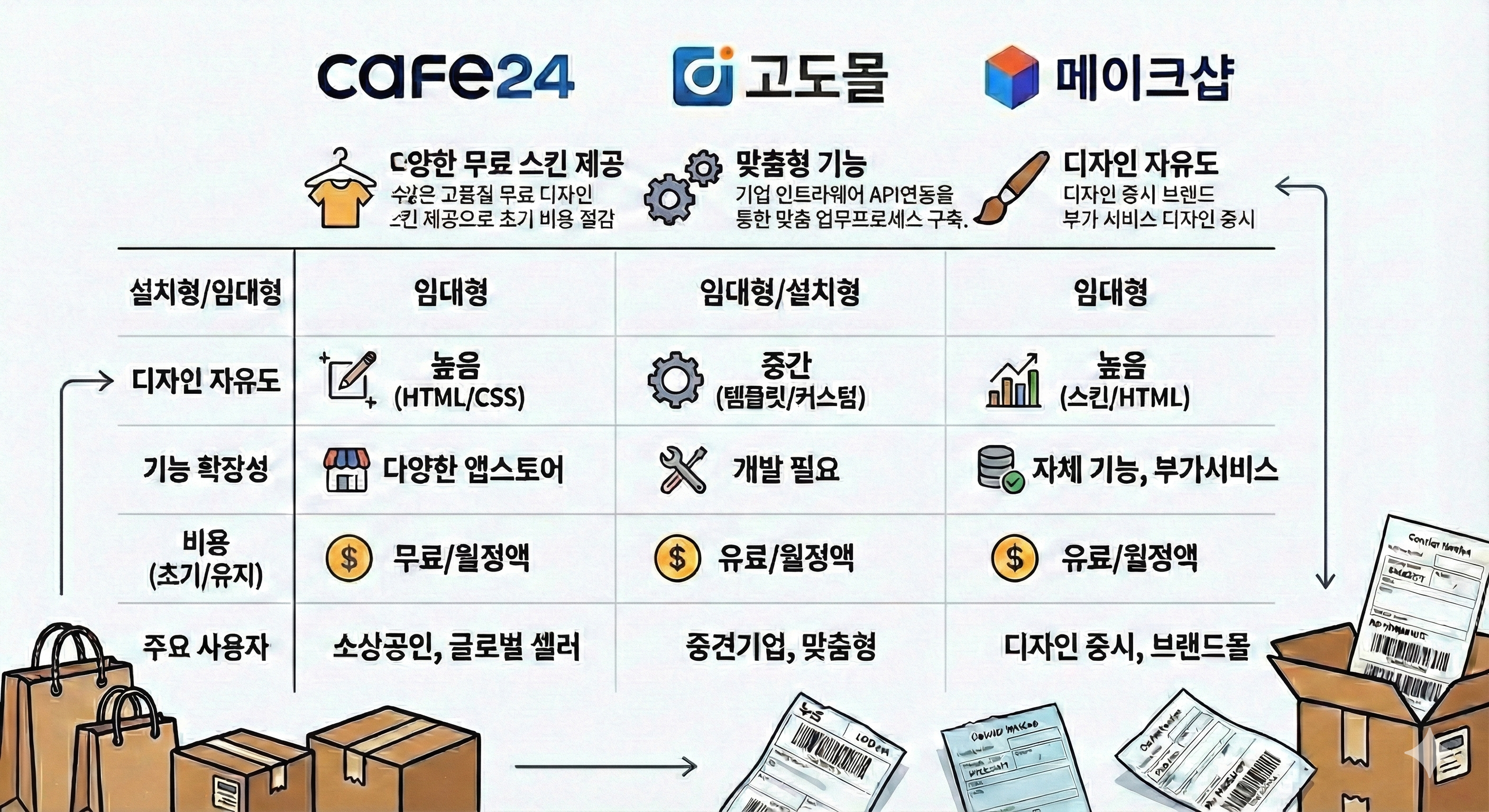 | 구분 | 카페24 (Cafe24) | 고도몰 (Godomall) | 메이크샵 (Makeshop) |