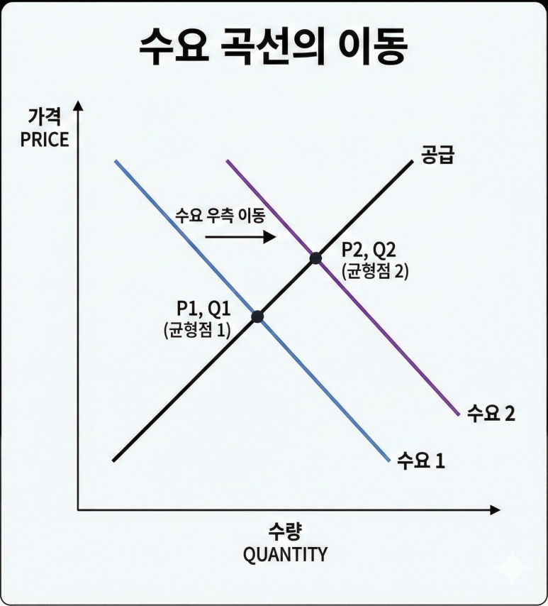 • 수요 곡선의 이동 : 기업의 세일즈활동은 소비자의 수요를 우측으로 이동시키는 행위입니다. 수요가 우측으로 이동하면 기업은 일정한 공급속에서 균형점을 찾아 수용대응을 해야만 합니다.