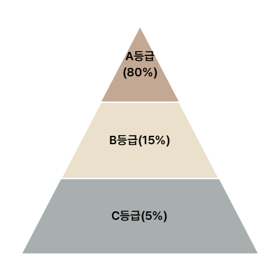 • A 등급 (집중 관리): 품목 수는 적지만 매출 비중이 압도적인 핵심 상품입니다. 빈번한 재고조사를 통한 발주 시스템과 더불어   자원을 집중 투여하여 결품을 방지해야 합니다.