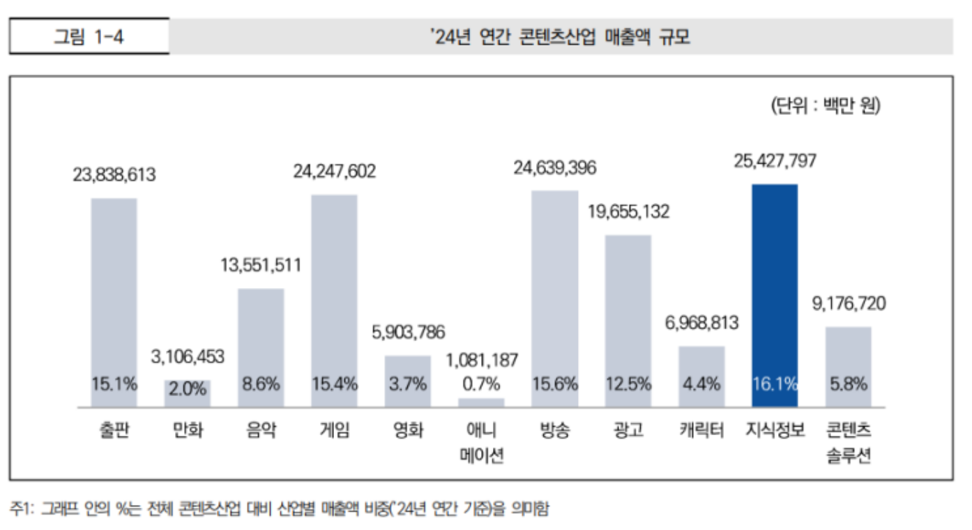 - 콘텐츠 시장의 점유율 재편: 2024년 기준 국내 콘텐츠 산업 매출 비중을 보면 지식정보(16.1%), 방송(15.6%), **게임(15.4%)**이 나란히 선두권을 형성하고 있습니다. 특히 게임 산업 매출은 약 24.2조 원에 달하며, 극장(영화 3.7%)을 압도하고 있습니다.