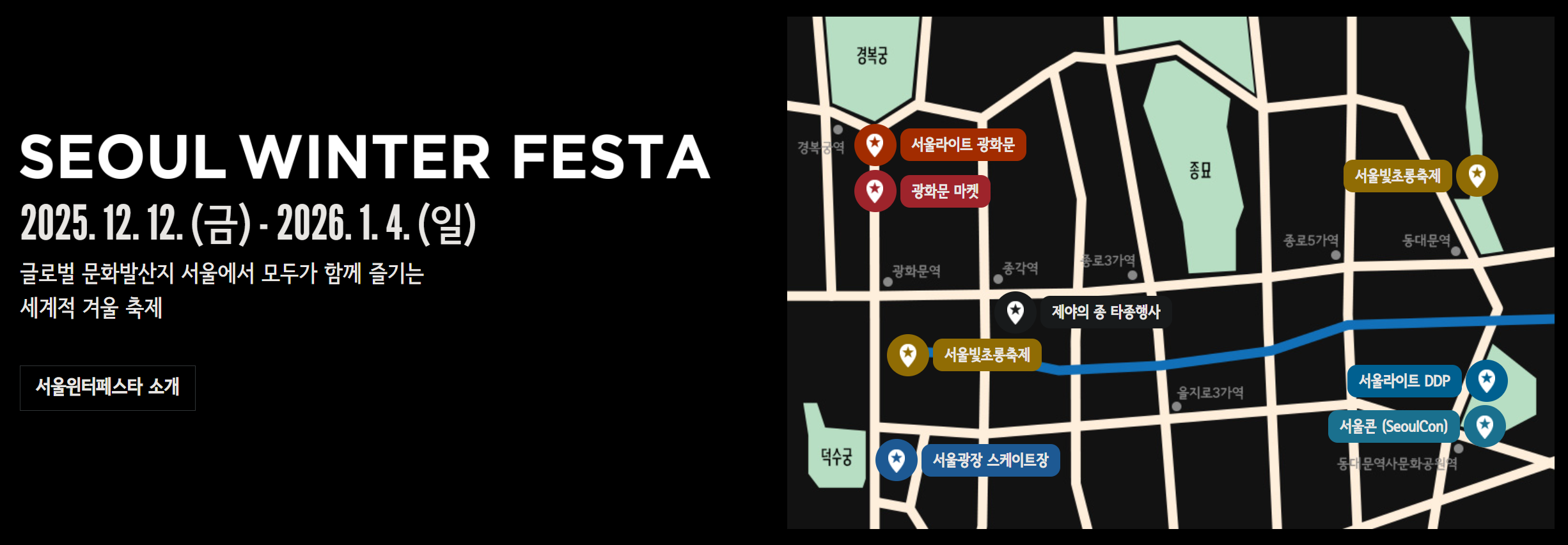 - 교통 팁: 윈터페스타 행사 구역이 광범위하므로 가급적 대중교통(지하철 1, 3, 5호선 및 2, 4, 5호선 DDP역) 이용을 추천합니다.